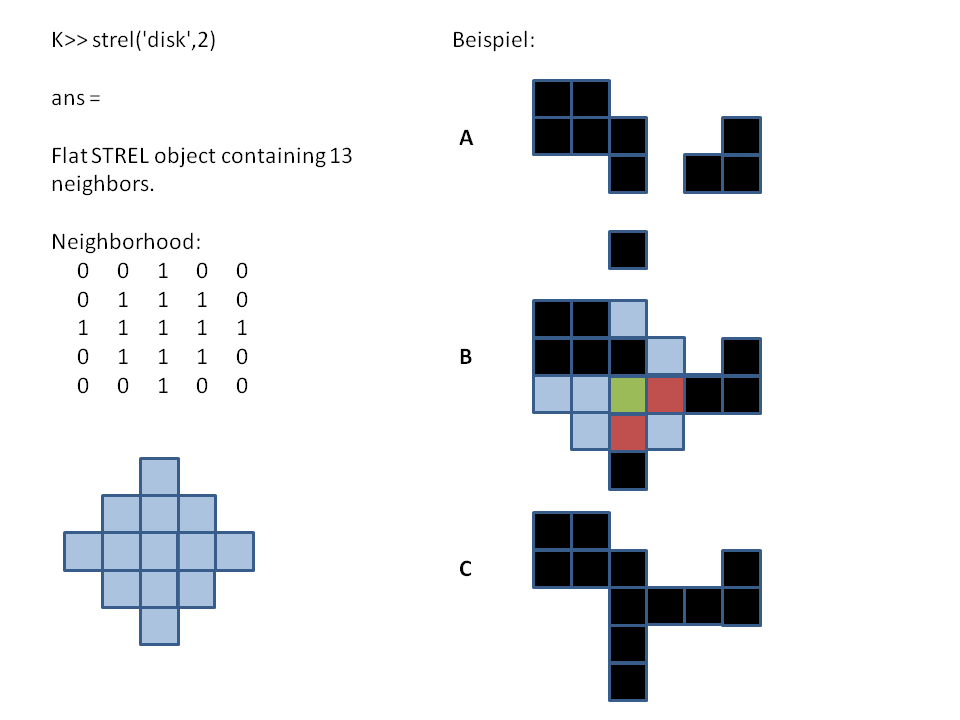 Ich habe mit strel('disk',2) ein STREL Objekt mit 13 Nachbarn erzeugt. Nun ist auf der rechten Seite der Grafik ein Beispiel. A ist ein Gebilde mit 3 isolierten Bereichen. In B wird die 2-Disk auf ein Pixel (grün dargestellt) des ersten isolierten Bereichs gelegt.