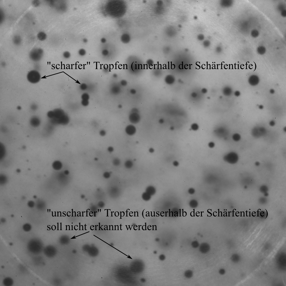 Wie auf dem Rohbild zu erkennen ist befinden sich einige Tropfen innerhalb der Schärfentiefe und werden scharf dargestellt, einige Tropfen jedoch außerhalb der Schärfentiefe der verwendeten Optik. Bei diesen Tropfen ist eine eindeutige Größenbestimmung aufgrund dessen, dass sie unscharf dargestellt werden, nicht möglich ( Diese Tropfen werden jedoch abhängig vom Schwellwert ebenfalls binärisiert.) Gibt es eine Möglichkeit den scharfen Bereich vom unscharfen verschmierten Bereich zu trennen? Hat hier jemand eine Idee? Filter, etc.