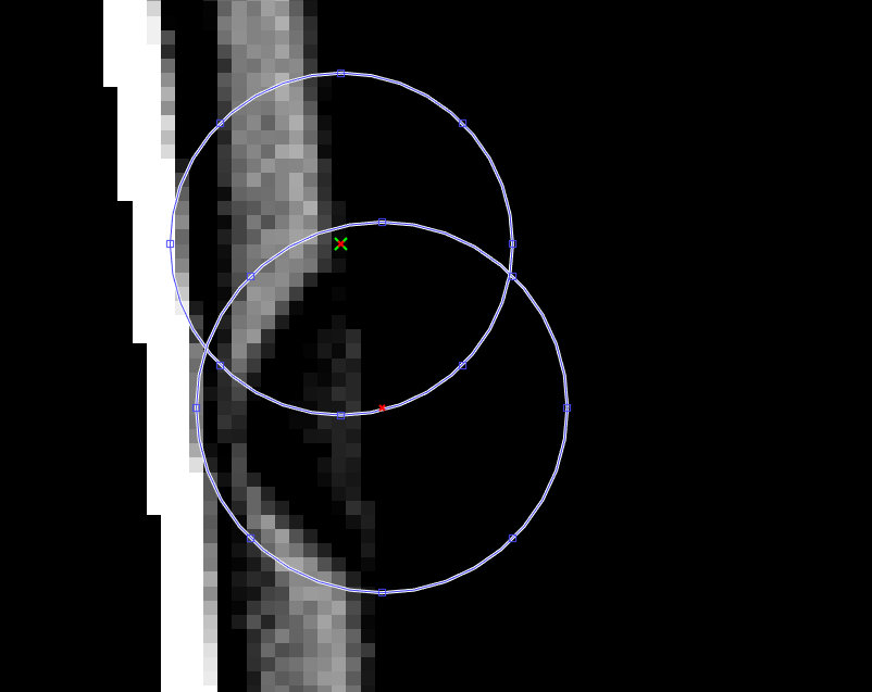 Der Kreis mit dem grün/rot markierten Mittelpunkt hat eine metric von 0,0677 und der untere Kreis nur 0,0581. Mal abgesehen davon, dass der untere Kreis mit einem meiner Meinung nach zu großen Radius gefunden wird, verstehe ich nicht warum der doch recht deutliche Halbkreis schlechter ist als die Kante daneben.