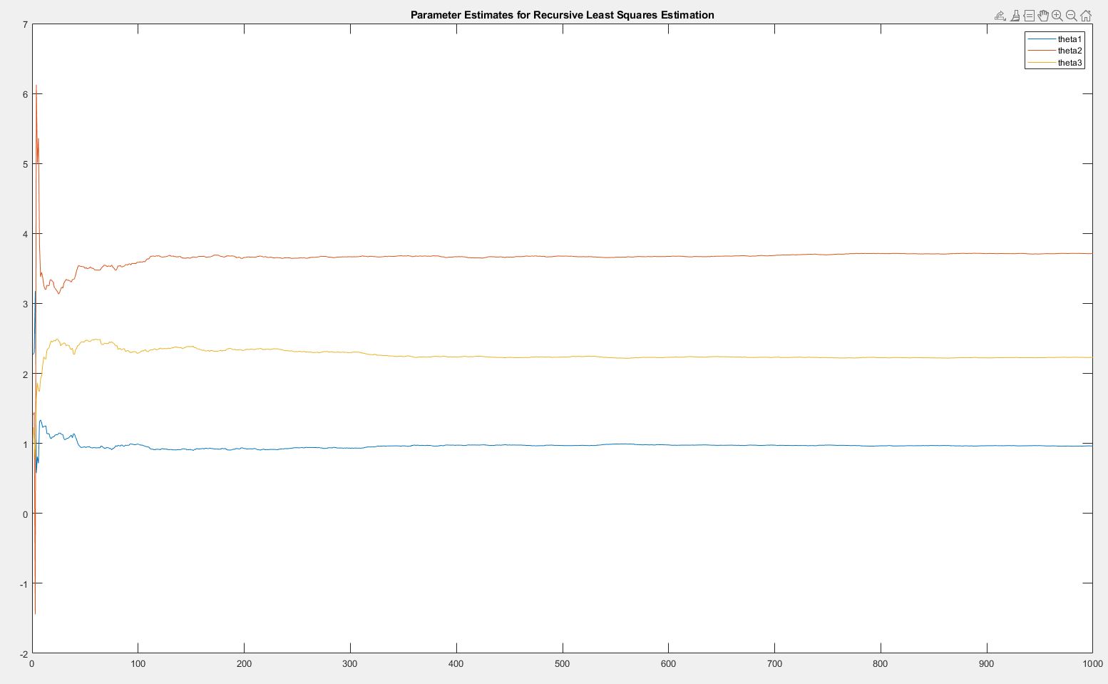 plot(numSample,theta_est(:,1),numSample,theta_est(:,2),numSample,theta_est(:,3)) title('Parameter Estimates for Recursive Least Squares Estimation') legend("theta1","theta2","theta3")