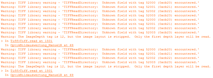 | Warnungen von Matlab bei Bildimport (Die TIF-Bilder bestehen aus je 2 Frames) |
