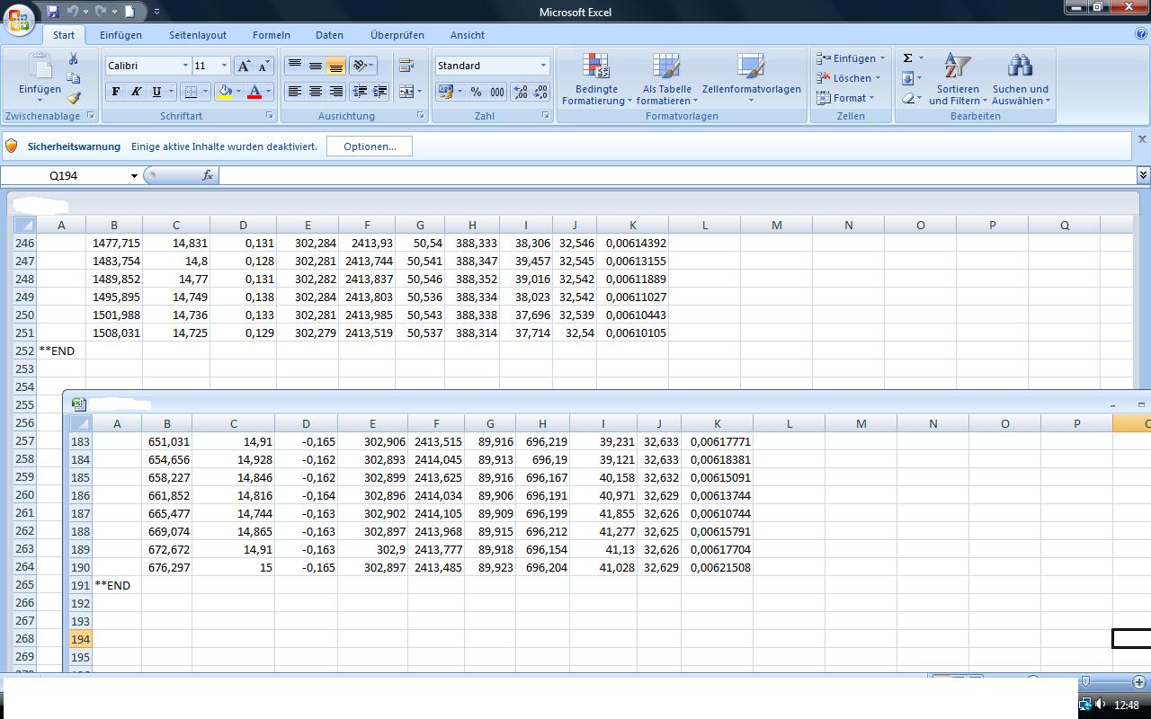 t1 sollen die Werte von A32 bis A250 (nur in diesem Fall) zugewiesen werden. Bei den anderen Spalten (B, C ..) funktioniert das auch, auch wenn der letzte Wert eine Null ist. Ich will den ti (t1, t2,...) die Werte der Spalten (A,B,...) ab Zeile 32 zuweisen. Gestoppt werden soll eine Zeile bevor die Zelle leer ist bzw. bevor (wie in Spalte A) ein String (**END) in der Zelle steht.