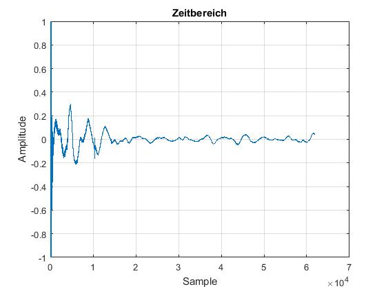 Jetzt kommt aber der Haken an der ganzen Sache. Wenn ich diesen Algorithmus nun auf meine Rauschsignale anwende, erhalte ich im Zeitbereich ein Signal, dass ich absolut nicht zuordnen kann. Es sieht je nach Parametrisierung ungefähr so aus wie im Bild PlatzTest. Durch andere Aufnhamen, in denen ich Klatschimpulse aufnehmen sollte, weiß ich aber, dass die Impulsantwort eher aussehen sollte wie in dem Bild ImpulsPlatzKurz.
