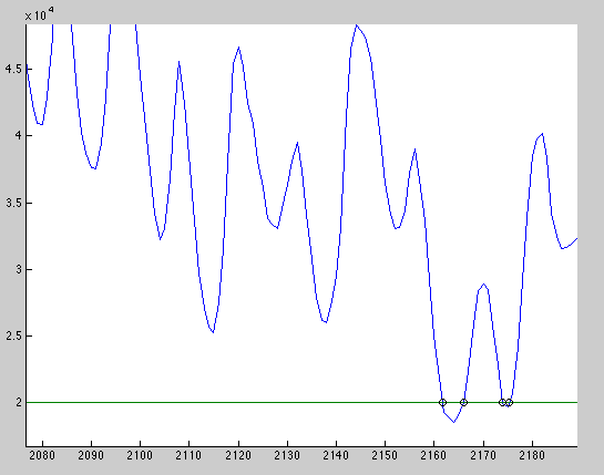 Nun möchte ich das Minima jeweils zwischen den beiden Schnittpunkten,daher suche ich die Stellen j,k im Vektor yi im zweiten Teil des Codes und ermittel die Minima. Es geht aber nicht wenn Matlab den Wert zweimal findet!