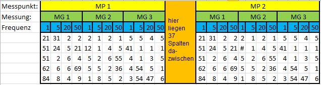 Es gibt eine n*m-Matrix (im Beispiel ist ist das V). Aus dieser Matrix sollen ausgewählte Spalten abrufbar sein, die in eine Variable gespeichert werden. WELCHE Spalte dabei abgerufen wird hängt von folgenden Gegebenheiten ab: welcher Messpunkt, Messung und Frequenz. Aus diesem Grund soll die Variable entsprechende Indizes erhalten. So steht der erste Index für den Messpunkt, der zweite für die Messung und der dritte für die Frequenz.