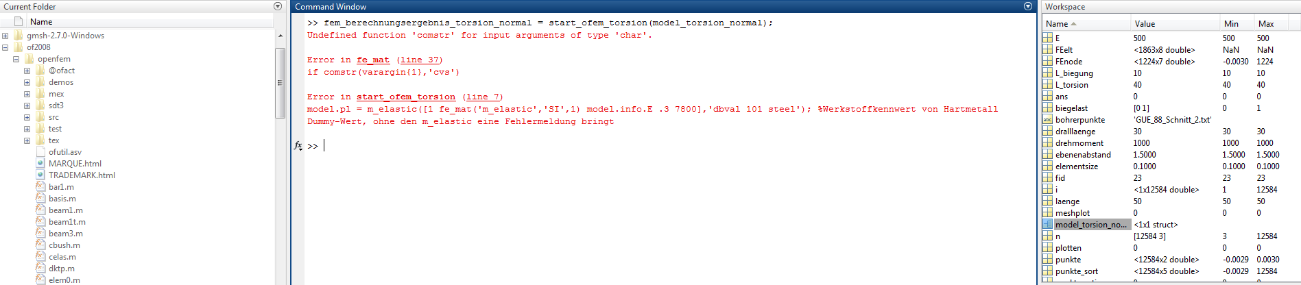 Ich erstelle mit Matlab einen Bohrer und möchte diesen nun auf Torsion untersuchen. Habe dazu ein Programm erhalten, dass auf die Funktionen von OPENFEM zurückgreift. Verwende ich nun diese Funktionen gibt mir Matlab eine Fehlermeldung.(s. Screenshot) Ich frage mich allerdings, wie ich OPENFEM richtig anwenden kann.