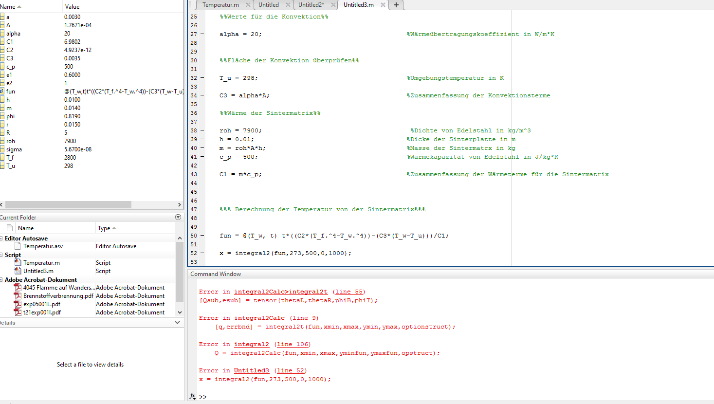 Error in @(T_w,t)t*((C2*(T_f.^4-T_w.^4))-(C3*(T_w-T_u)))/C1