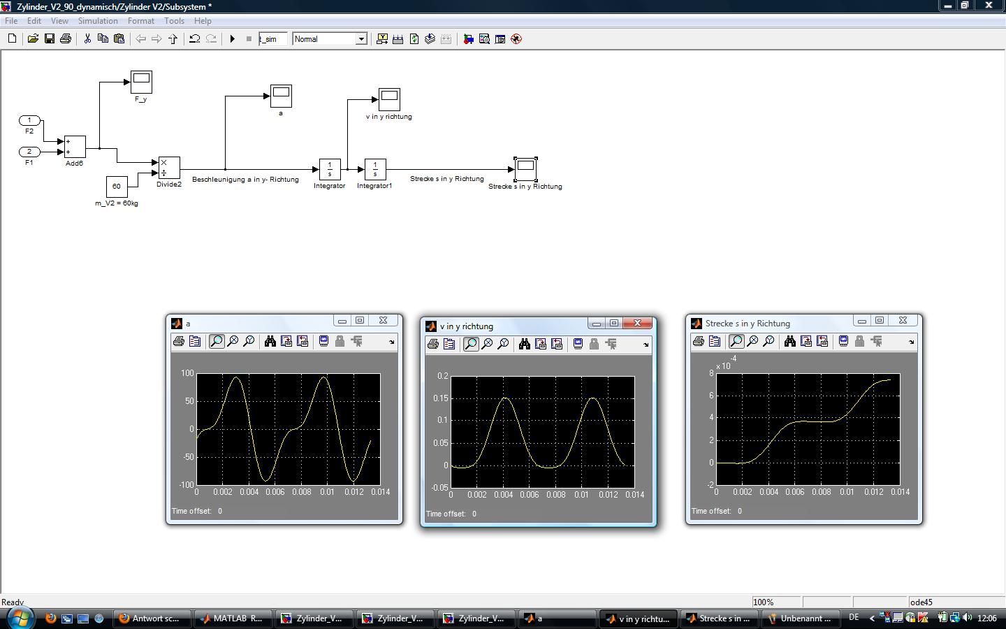 Hier ist das Modell. Man muss zunächst die Initialisierung durchführen und kann dann das Modell starten. Es geht dabei im konkreten um das Subsystem a_y ganz rechts im Modell. Dort soll aus einer Kraft ein Weg hergeleitet werden.