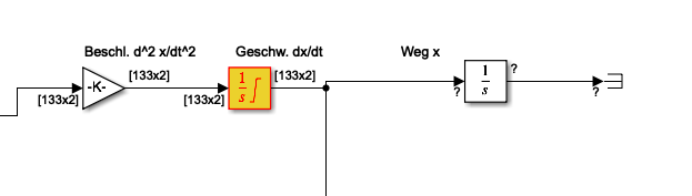 Über einen Integrator möchte ich die Beschleunigung zu einer Geschwindigkeit und anschließend die Geschwindigkeit zum Weg integrieren. (Siehe Anhang)