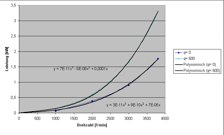 diese 2 Gleichung angebe, und mir zwischen den Volumenströmen interpoliert wird (Bsp. P=1,25, n = 3000 => q=300)
