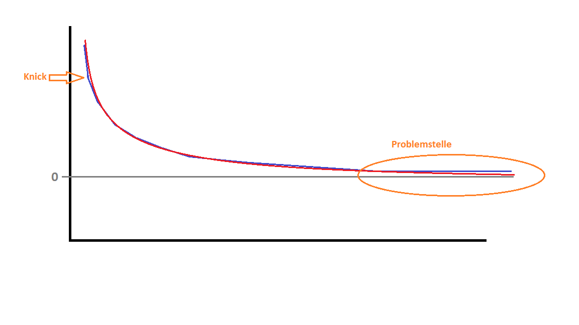 Die e-Funktion nähert sich ja, und das ist unvermeidlich, immer weiter an Null an. Wenn diese dann aber den Endwert unterschreitet beginnt das Problem. Die Werte werden unendlich klein und da ich anschließend die gefundene Kurve invertieren muss explodieren mir die Werte dabei.