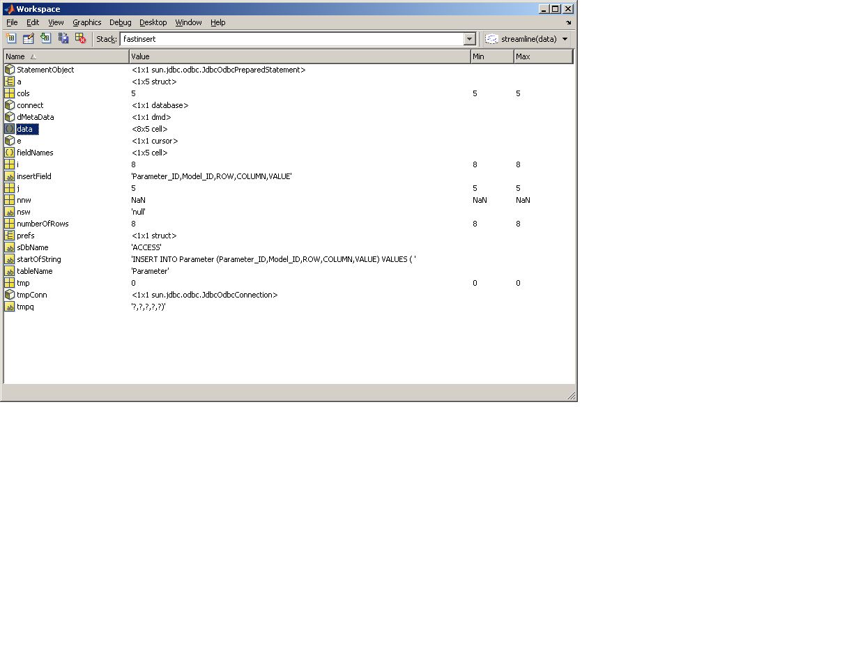% FASTINSERT(CONNECT,TABLENAME,FIELDNAMES,DATA). % CONNECT is a database connection handle structure, FIELDNAMES % is a string array of database column names, TABLENAME is the % database table, DATA is a MATLAB cell array.