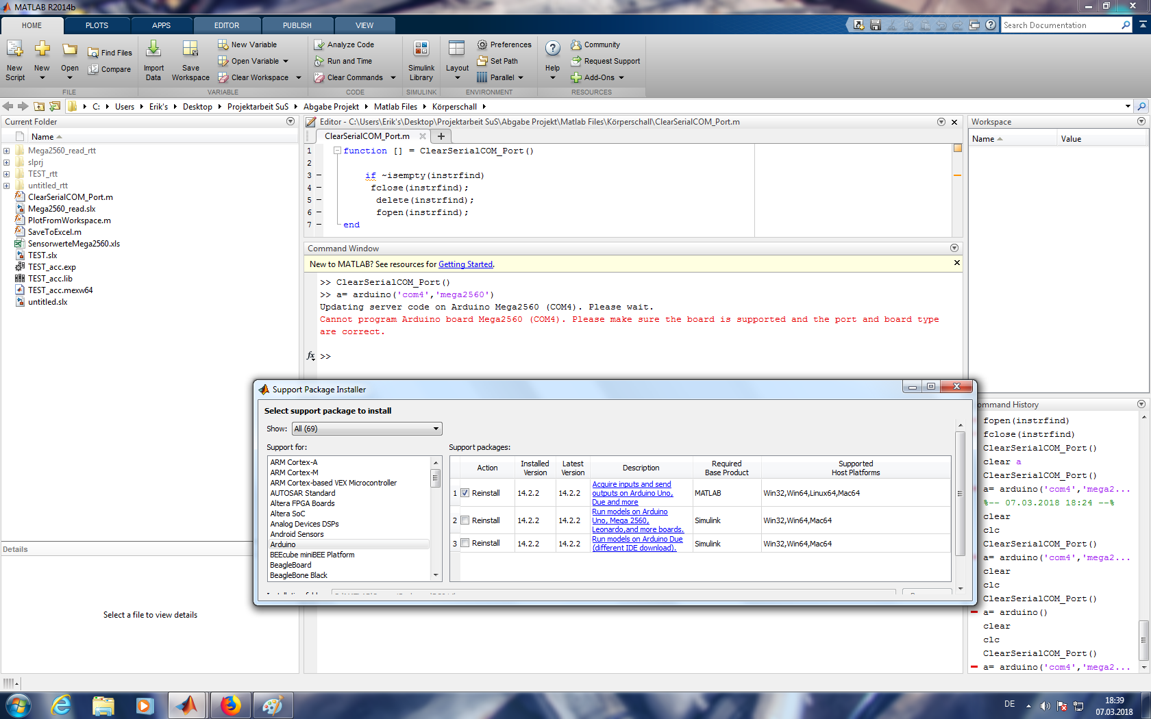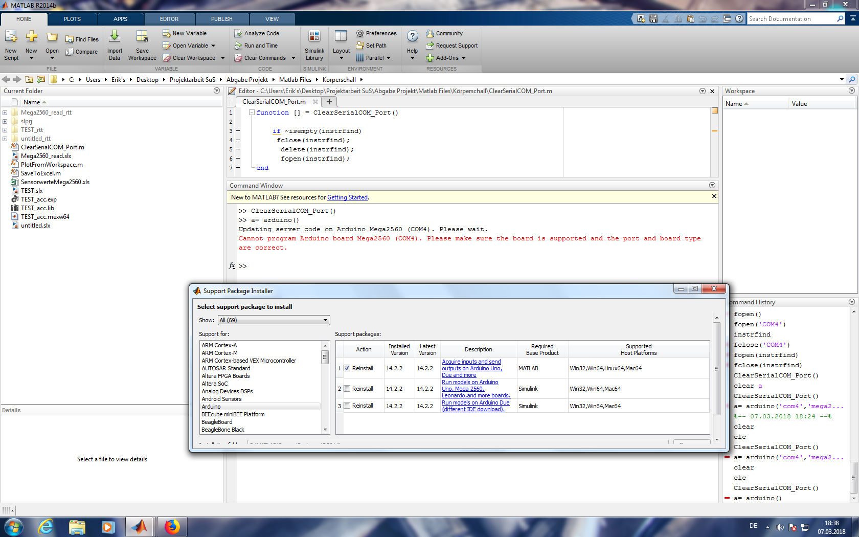 Ich lasse Matlab als Administrator ausführen, habe den COM Port aus dem Geräte Manager überprüft, habe alle Support Packages installiert und sogar per INSTRFIND alle Überschüssigen Verbindung zu COM Ports aus aktuellen oder noch belegten Matlab Ausführungen aufgespürt, geschlossen und gelöscht.