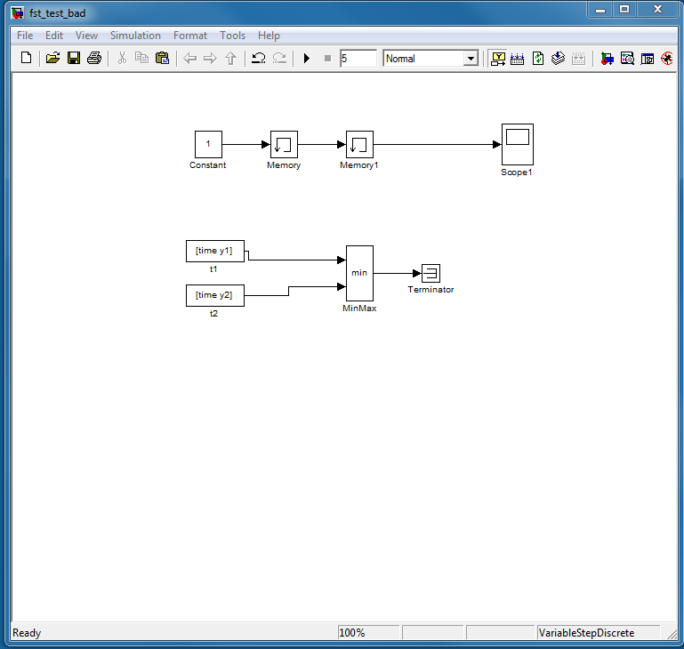 Ich habe ein Simulink-Modell (siehe Bilder), welches aus 2 Vektoren aus dem Workspace einen MinMax-Wert bildet. Ein anderer Teil des Modells verzögert eine Konstante 1 um 2 Integrationsschritte.