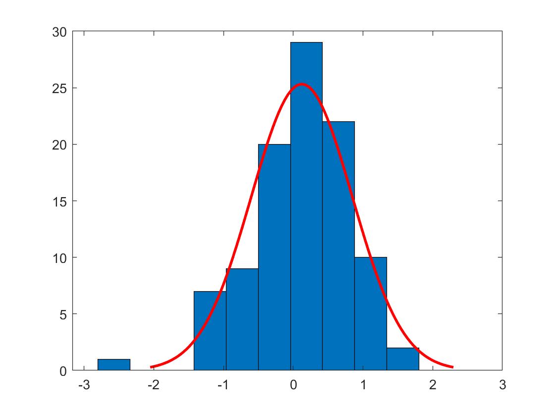 ich habe Problem mit den richtigen Befehlen für das Einzeichnen eines Konfidenzintervalls in eine Normalverteilung über selbst ermittelte Messdaten. Ich habe mir aus meinen Messdaten (schwankende Anzahl <100.000 Messwerte) den Mittelwert, die Standardabweichung sowie die Konfidenzintervalle von 2 Sigma (Vertrauensbereich 95%) berechnet. Jetzt möchte ich mir über alle meine Messwerte ein Histogramm plotten mit dem Einzeichnen der Kurve einer Normalverteilung. Ergänzen möchte ich diesen Plot mit den Einzeichnen der Konfidenzintervalle und einer Linie für den Mittelwert. Bis jetzt habe ich mir mit dem Befehl "histfit" eine Histogramm mit einer Kurve als Normalverteilung plotten lassen. Soweit so gut. Das Ergebnis habe ich im Bild 1 (Histgramm1) dargestellt. Der Programmcode dazu ist recht simpel: