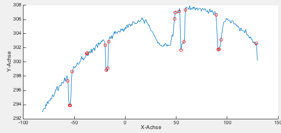 die Gefunden Punkte habe ich berechnet in dem ich die Steigung Größer als ... mir anzeigen lasse, da das jedoch gar nicht geklappt hat habe ich die Steigung dann aus einem Gleitenden Miteilwert gebildet. jedoch ist das noch sehr ungenau