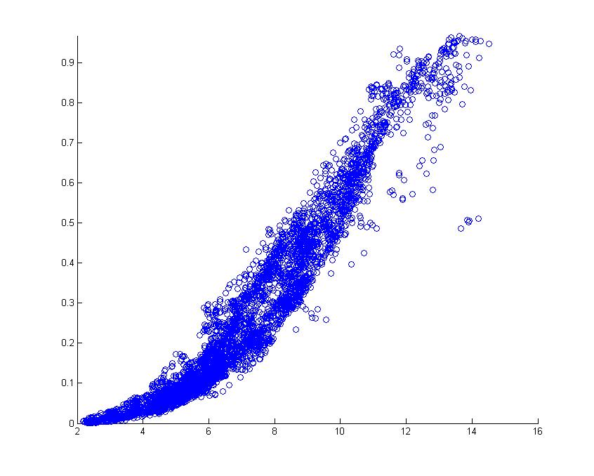 aus meinen messwerten habe ich folgende 'Datenwolke' erhalten. Aus den Durchschnittswerten will ich nun eine einzelne Kurve erstellen. Die Interpolation über interp1 schlägt fehl da teilweise mehrere identische x- Werte vorhanden sind. Gibt es hier die möglichkeit eine Kurve über regression herazustellen? Oder hat sonst irgendjemand eine idee??