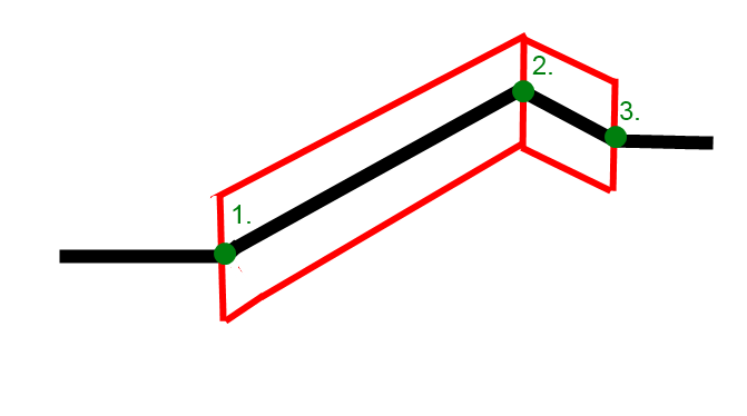 In einem 2D Koordinatensystem habe ich drei Punkte (1,2,3) vorgegben. Eine Kurve muss durch diese Punkte verlaufen. Dabei darf die Kurve von der direkten Verbindung (schwarze Linie) nur um ein gewisses Intervall (roter Bereich) abweichen. Mein Ziel ist es die Kurve zu finden bzw. die Koeffizenten der Kurve, welche die Punkte mit der geringsten Krümmung verbindet.