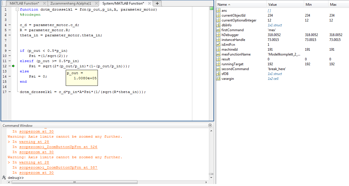 In der Modellgleichung der Drosselklappe befindet sich eine Wurzelfkt deren Argument negativ wird wegen (p_out>P_in)