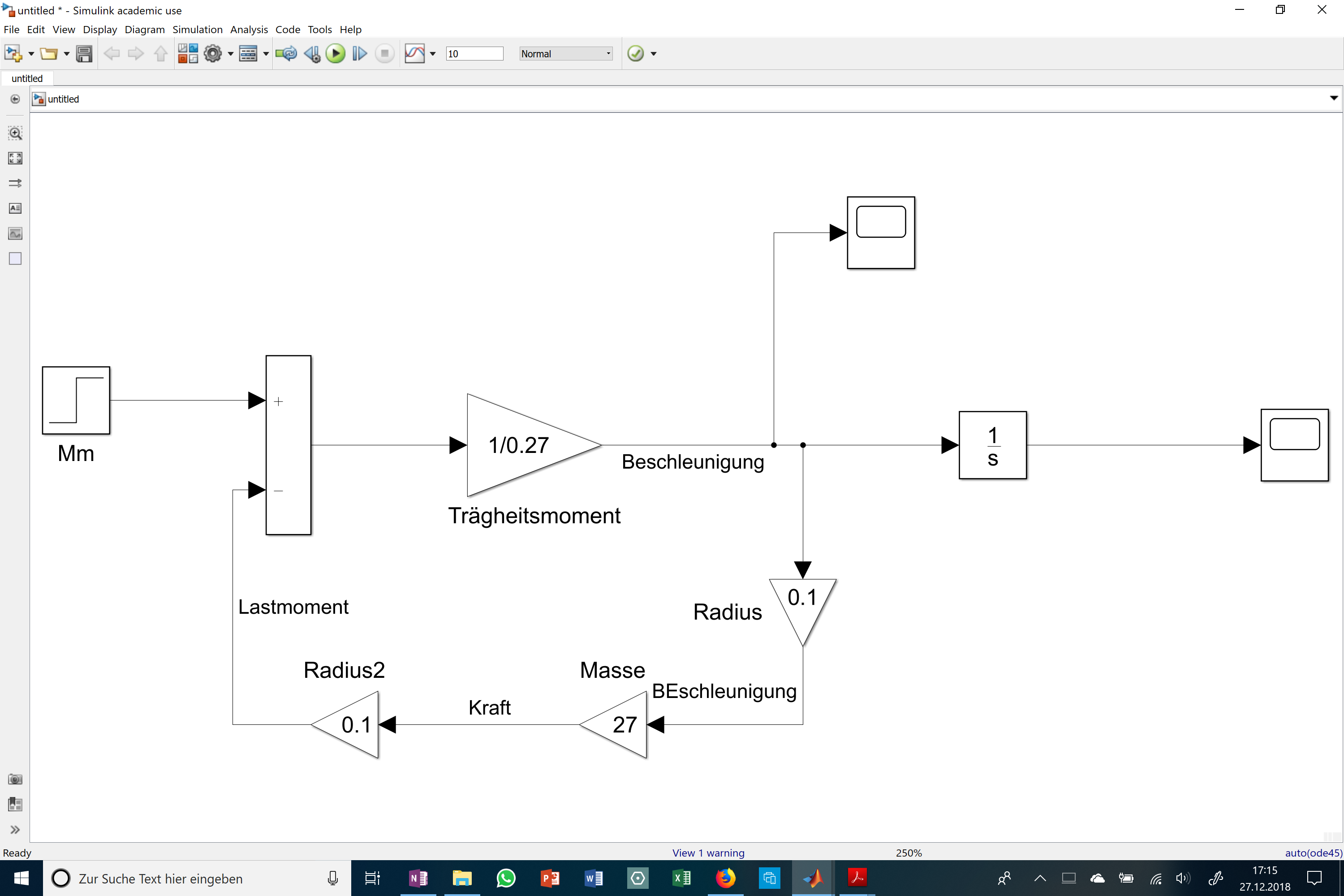 Ich versuche ein Simulinkmodell wie auf Screenshot10 zusehen ist aufzustellen. Auf dem Screenshot11 ist mein Modell. Ich habe es nach der Gleichung: