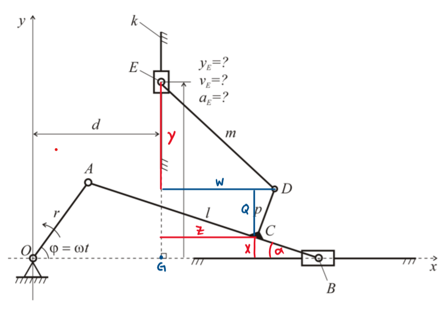 Sobald sich der Winkel φ ändert, ändern sich automatisch auch die Distanzen OB und EG. Die Aufgabe ist es herauszufinden bei welchem Winkel φ die Grösste Distanz zwischen E und G liegt. Gegeben sind alle Längen der Hebel und die Länge d.