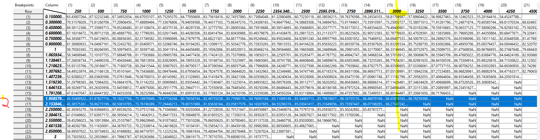 bei 2D kann Simulink nicht entlang einer Linie gehen, sondern braucht (min.) 4 Eckpunkte einer Fläche. Anscheinend wählt Simulink, wenn der y-Wert mit einem Table-Wert übereinstimmt, die Fläche rechts davon, und für y = 3250 und x = 2.15... ist NaN eingetragen.