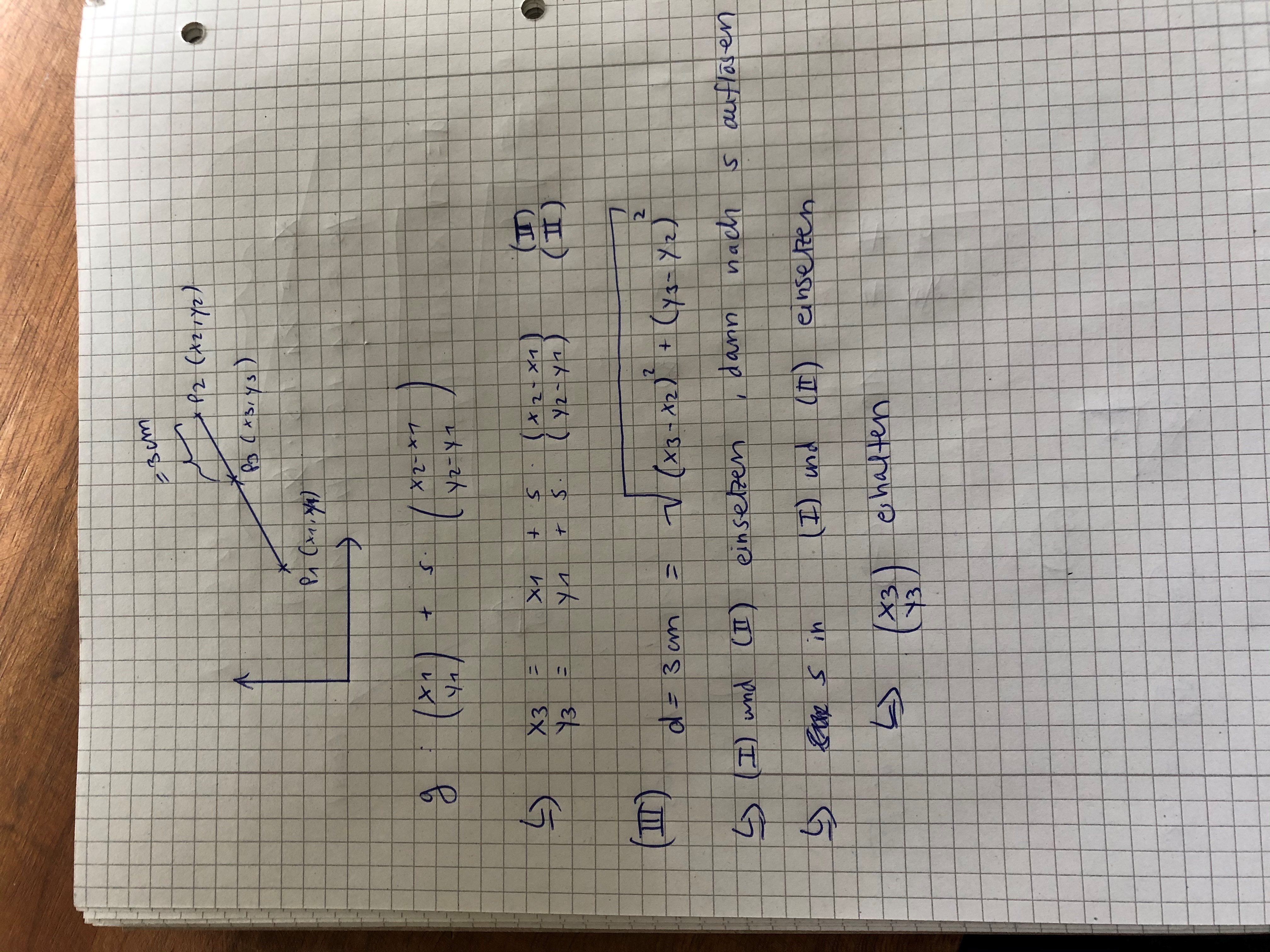 ich habe eine Gerade aus 2 Punkten aufgestellt und möchte nun, vom zweiten Punkt aus, den Punkt auf der Geraden berechnen, der 3 cm entfernt ist (siehe Foto).