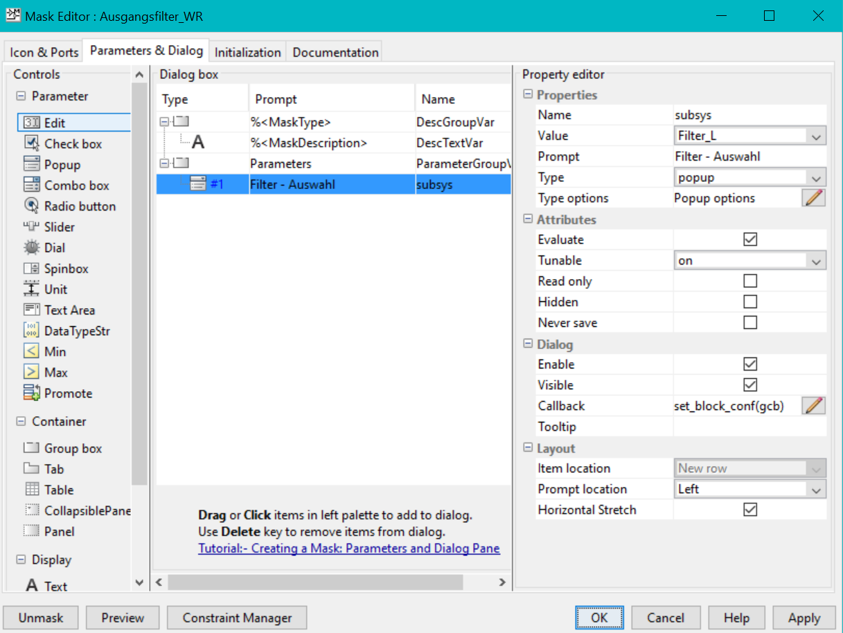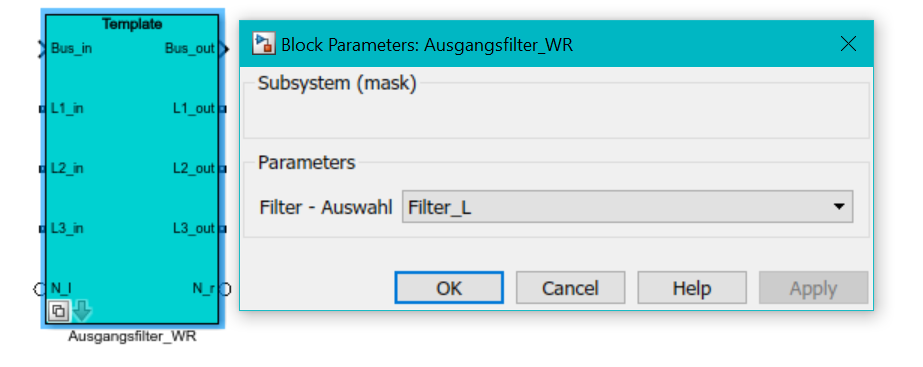 Mein Problem: Für jeden dieser Block-Choices habe ich eine Maske erstellt, wodurch ich verschiedene Parameter ändern kann, leider werden mir die Masken nicht angezeigt, wenn ich die Blöcke über das Configurable Subsystem und die darin aufgerufene Funktion auswähle.