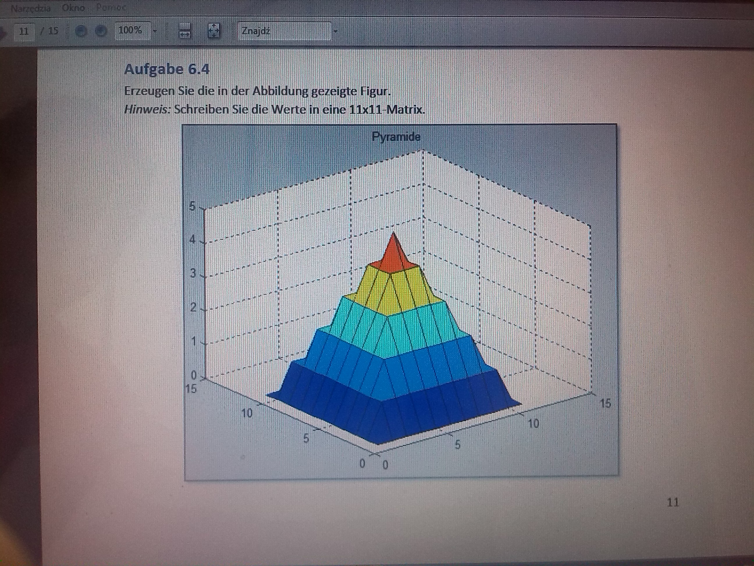 Hallo, zussammen! Hab' ne Aufgabe bekommen. Eine Pyramiede in MatLab zu zeichnen. Habe leider überhaupt keine Ahnnung. Vielen Dank.