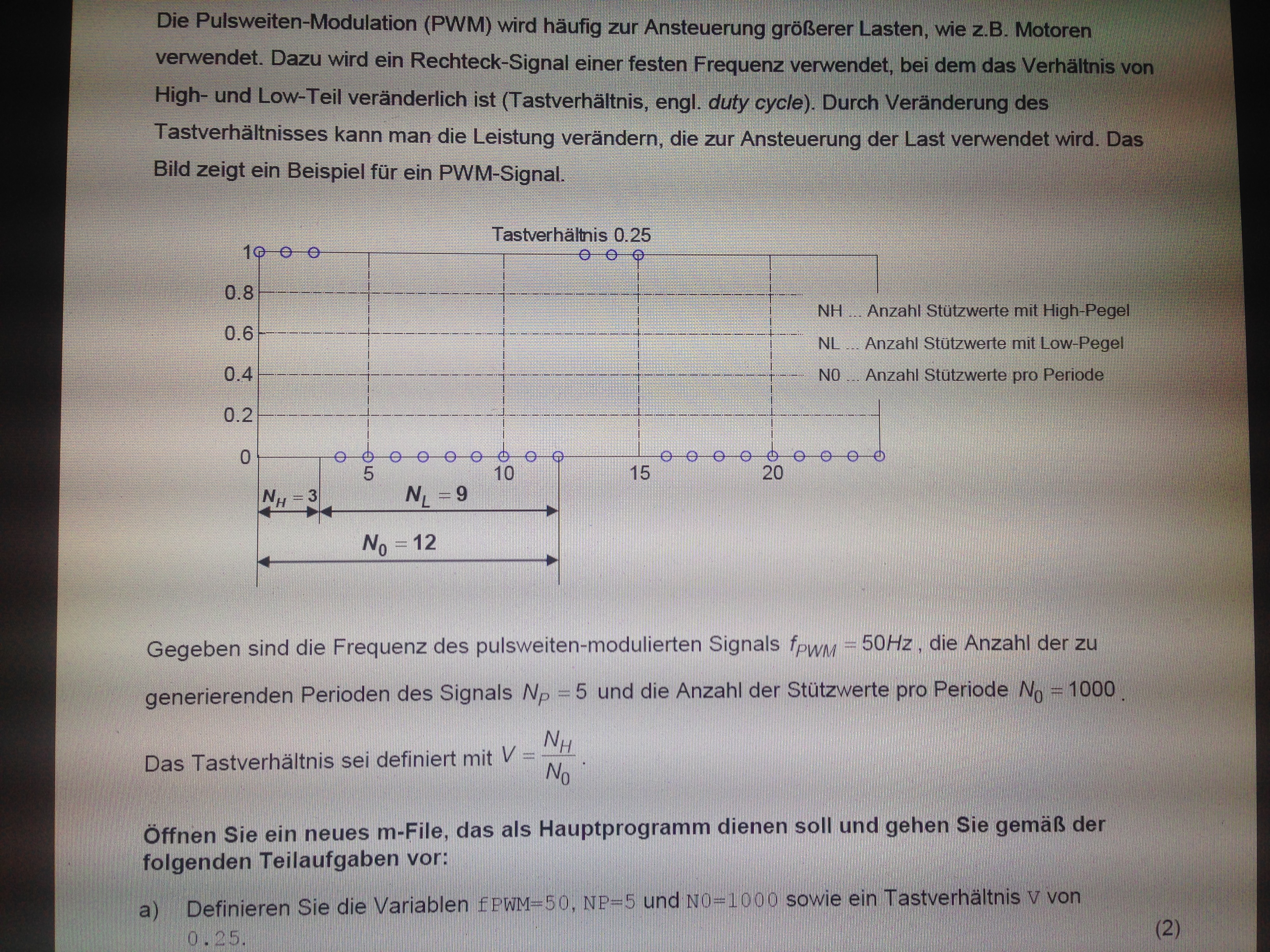 Auf Basis der Frequenz fPWM berechnen Sie die Schrittweite dt für N0 Stützwerte pro Periode und die Signaldauer tend von x und definieren einen zu x passenden Zeitvektor t.
