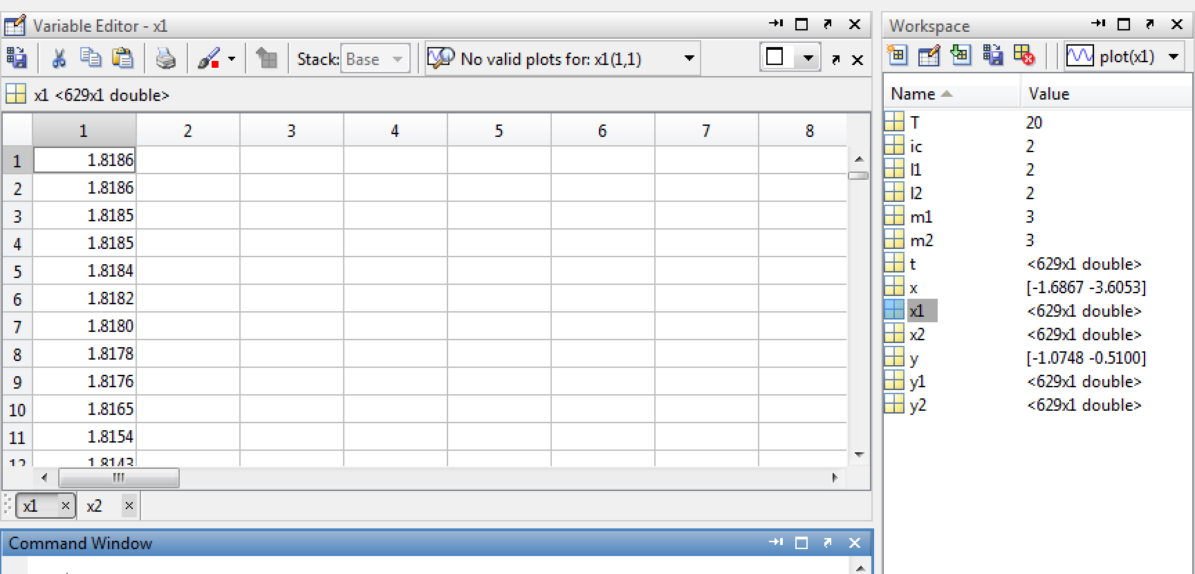 Ich habe z.B. wenn ich die Ode lösen lasse 629 x1 Werte. wie kann ich denn auf das erste zugreitfen um es polten zu lassen? Wenn ich z.B. x(1) eingebe, zeigt er mir nur den letzten x1 wert an.