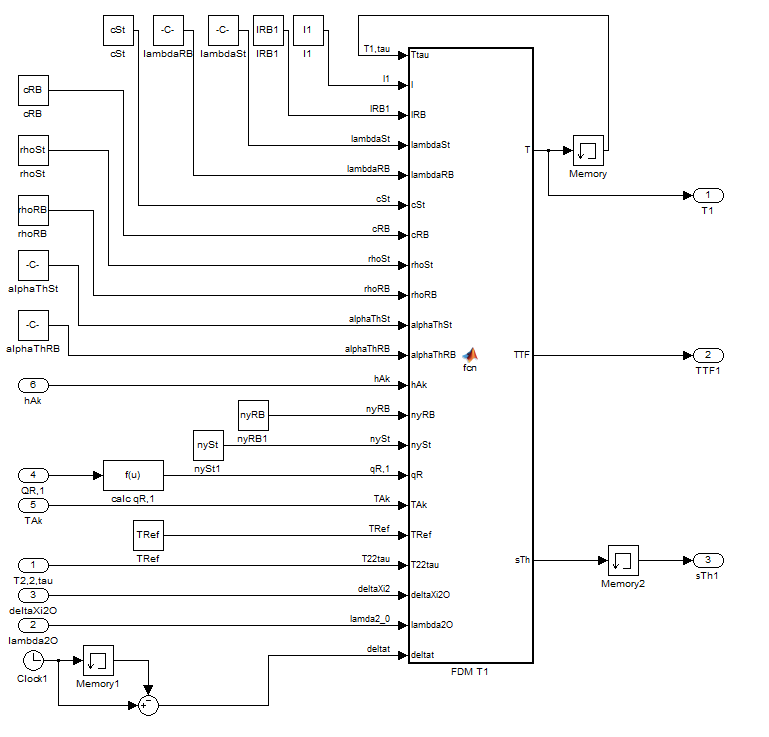 Die Matlab Function verwendet die Finite-Differenzen-Methode um ein Temperaturfeld zu berechnen. Aus diesem ergibt sich eine Längenänderung (sTh1), welche eine Eingangsgröße eines weiteren Subsystems ist. Dieses berechnet dann durch Integration einen Wärmestrom, welcher wieder als Eingangsgröße zur Berechnung des Temperaturfeldes dient. Zur Anwendung der Finite-Differenzen-Methode muss ich den Zeitschritt kennen. Dieser ist allerdings nur für den aktuellen Simulationsschritt bekannt (über die Clock berechnet), benötigen tue ich aber nicht den aktuellen, sondern den nächsten Zeitschritt. Mit den Memory-Blöcken verzögere ich einfach die Berechnung des Temperaturfeldes um einen Zeitschritt und löse damit das Problem.