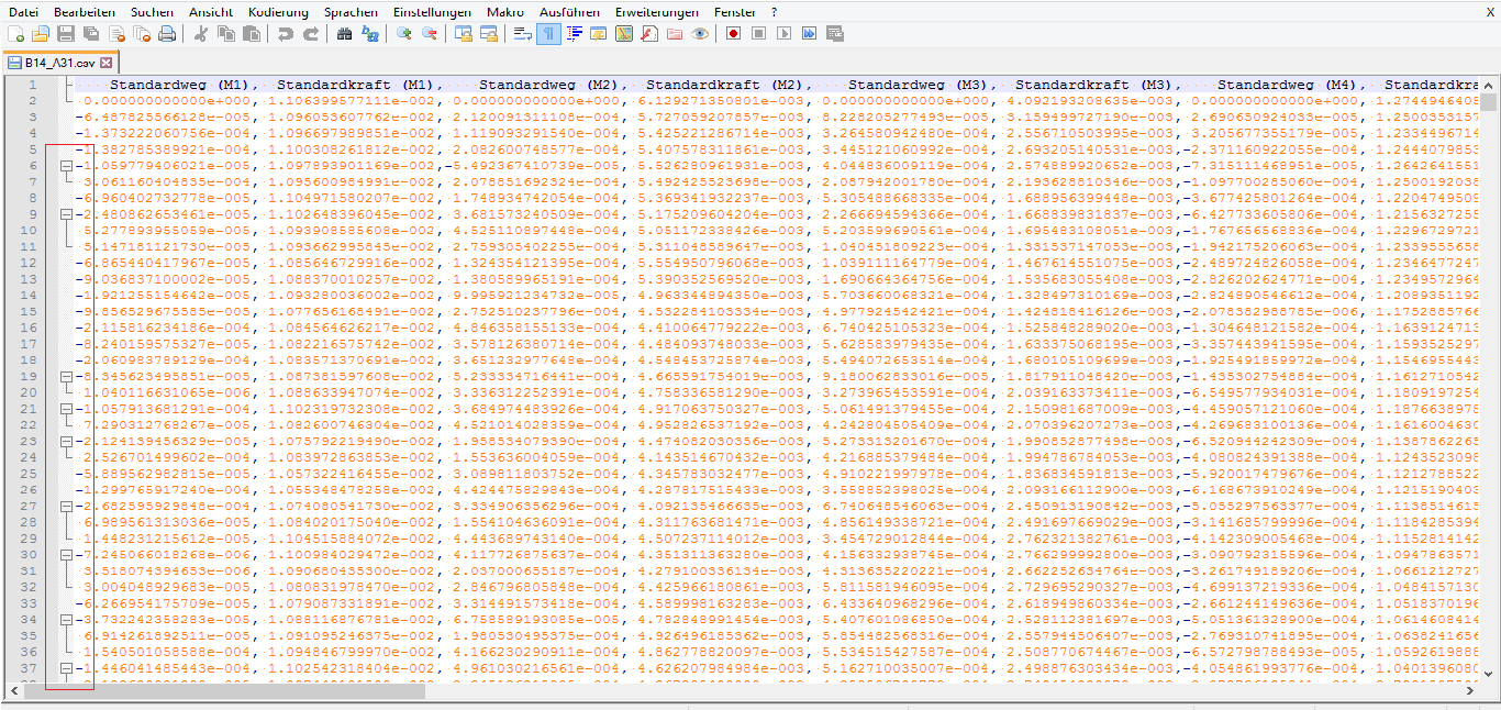 sorry für die unsaubere Problembeschreibung. Also ich habe eine CSV-Datei die Werte von einem Biaxialen Zugversuch enthält. Dabei wurde die Probe insgesamt 12 Mal auf eine bestimmte Länge gedehnt (10%) . Anbei sind Screenshots von der Notepad Umstellung.