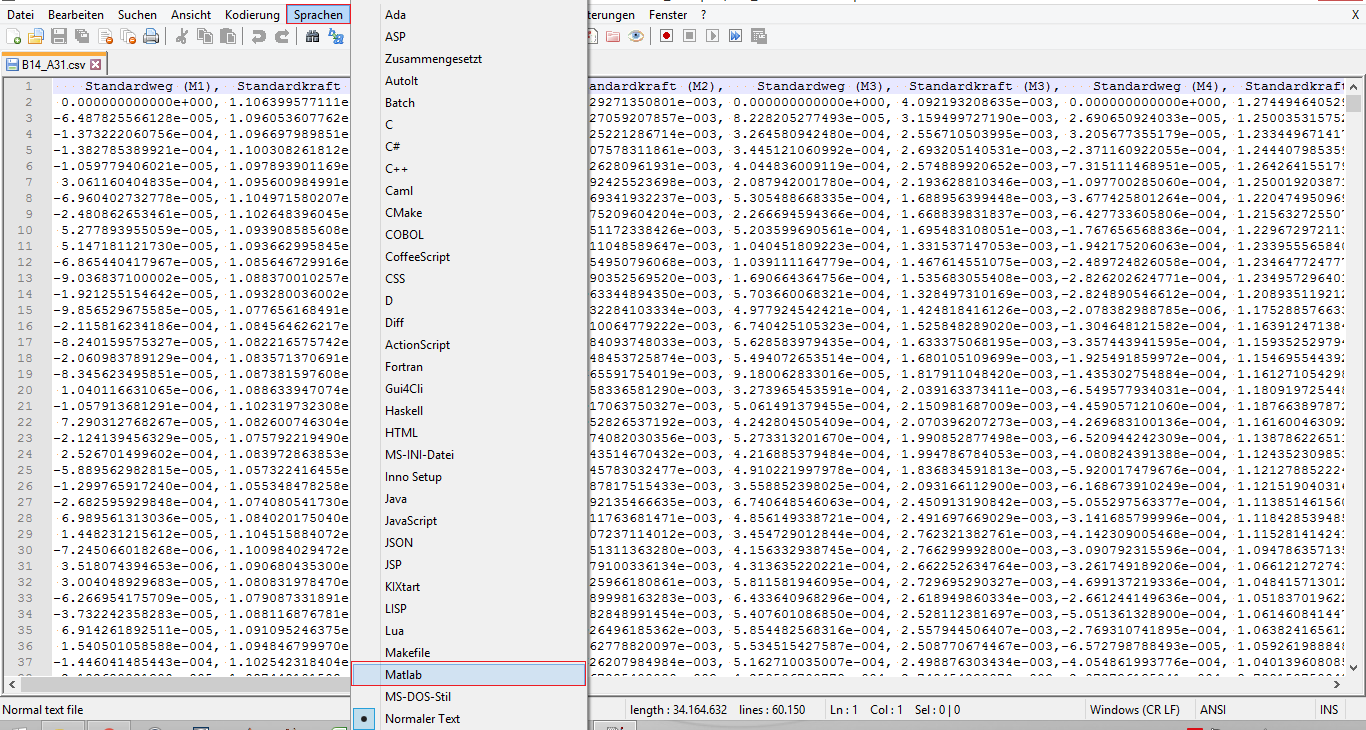 Hier Notepad++ ein CSV-File einfach mal als Matlab-Code interpretieren zu lassen ist eine seltsame Idee. Die Annahme, dass Notepad++ dabei etwas sinnvolles macht, ist nicht wirklich begründet, und falls das wirklich geschieht, ist das wohl eher Zufall. Lasse Dich davon also nicht verwirren.