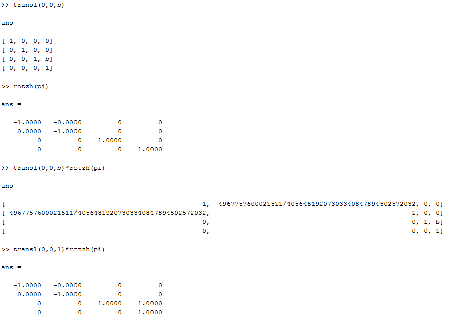 Ich versuche ein paar Homogene-Transformationsmatrizen zu berechnen, jedoch spielt Matlab nicht ganz mit. Wenn ich einen syms value b einsetze, werden die Zahlen, die eigentlich in der Grössenordnung 1e-16 sind, nicht zu null (b ist nicht ein Faktor der Zahlen). Im Anhang ist ein Bild davon. Wenn ich hingegen normale Zahlen einsetze funktioniert das einwandfrei. Jemand eine Idee?