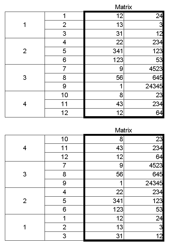 ich habe eine Matrix die so aussieht wie der obere dick umrandete Bereich im angehängten Bild. Diese möchte ich nun so umstellen, dass sie so aussieht, wie der untere dick umrandete Bereich. Dabei ist noch zu ergänzen, dass sowohl die Anzahl der Gruppen (jetzt von 1-4) und die Anzahl der Zeilen in den Gruppen (jetzt von 1-3) variable ist.