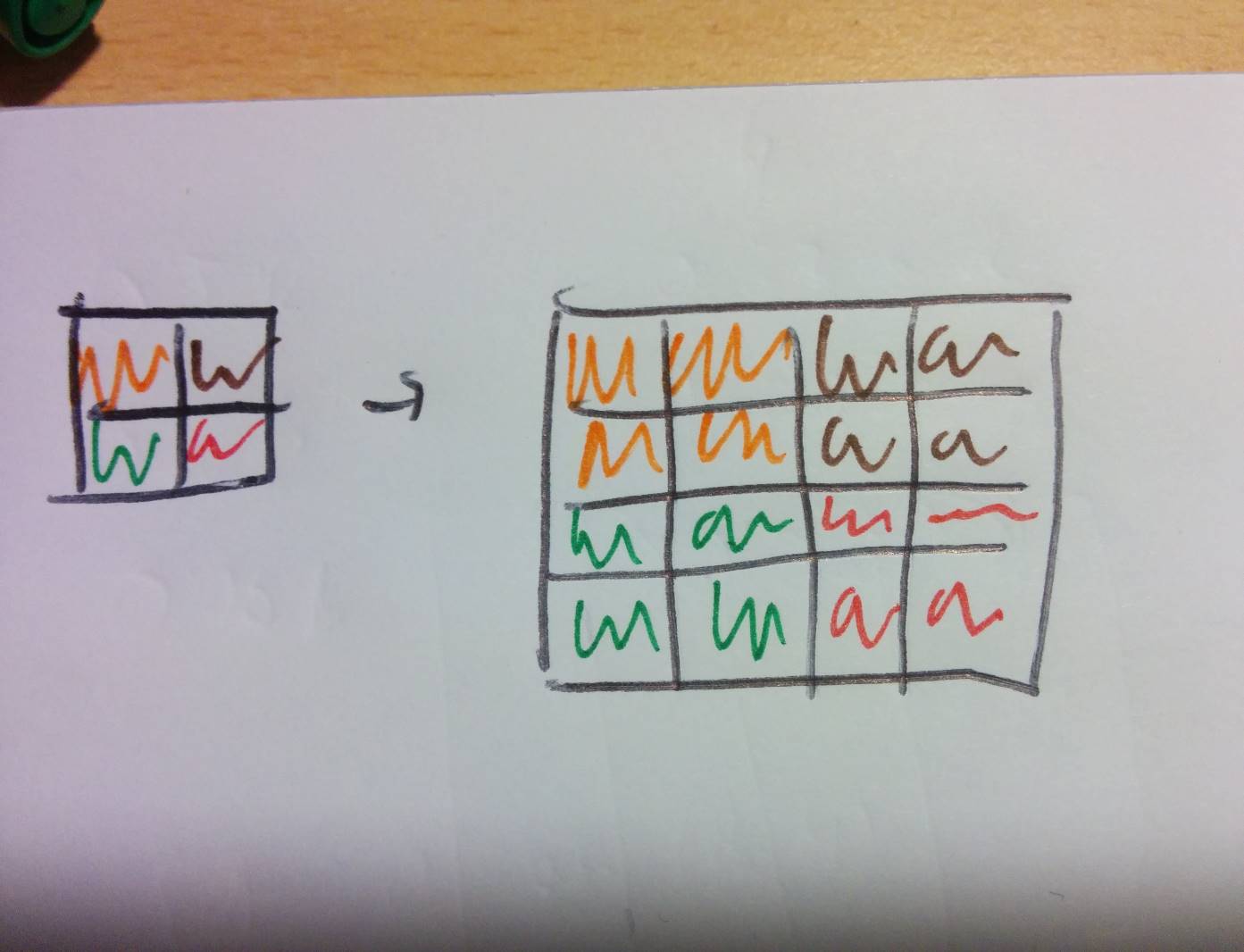 Kann ich in Matlab irgendwie diese Matrix sowohl in Höhe als auch in Länge so verdoppeln, dass alle Werte 4 mal beieinander stehen.