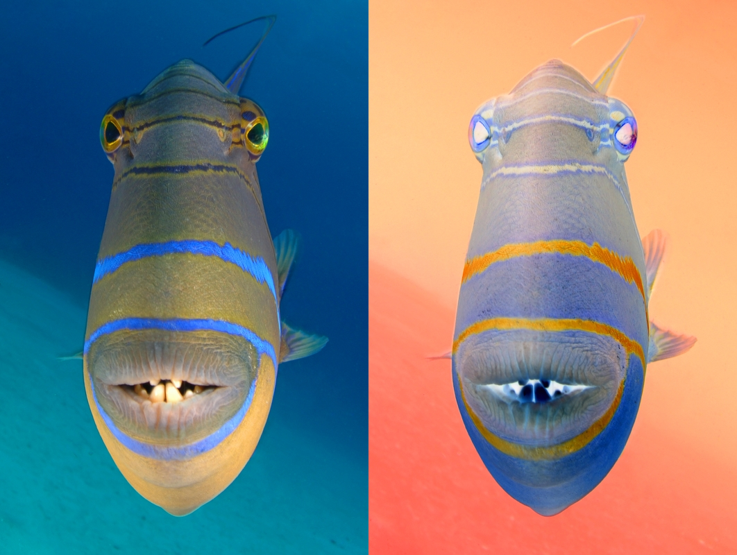 Bei dem Bild Aufgabe1.png handelt es sich um eine Bilddatei im Format uint16 (16 Bit, also 2 Byte), die ein Bild sowohl in Echtfarbe und als auch in Komplementärfarbendarstellung anzeigt. Dabei ist allerdings das untere Byte zur Übertragung zweier nichtsichtbarer Bilder genutzt.