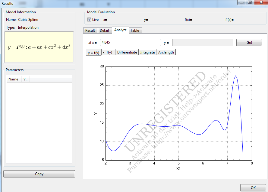 Das können viele mathematische Programme wie z.B CurveExpert, die aus mehreren Punkten sozusagen die Kurve verbinden und dann über eine grafische Oberfläche, mit einen x-Wert den zugehörigen y-Wert zu erhalten. Siehe Bild. Alle Punkte sind bekannt. Mir gehts hier nur um mit dem x-Wert den y-Wert zu erhalten. Die anderen Funktionen wie Integral, Differential usw. brauche ich nicht