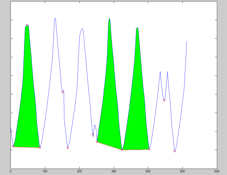 Ich will die Fläche unter einem Messsignal berechnen. Das Signal wiederholt sich periodisch, wobei die Maxima variabel sind, die minima sind in jeder Messung etwa auf dem selben Niveau. Das Problem ist nun, dass ich nicht die gesamte Fläche brauche, sondern jeweils die pro Periode (siehe Bild).