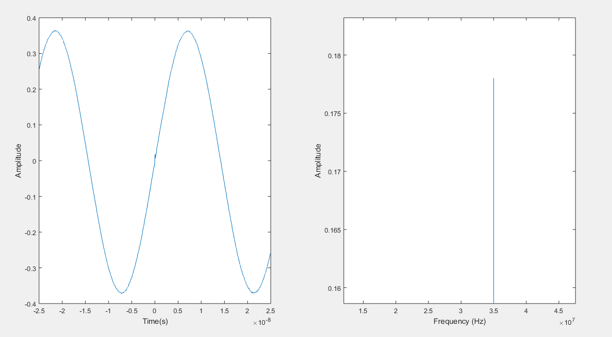 subplot(1,2,1), plot(signaltime,signaldata) xlabel('Time(s)'),ylabel('Amplitude') subplot(1,2,2), plot(f,p) xlabel('Frequency (Hz)'),ylabel('Amplitude')