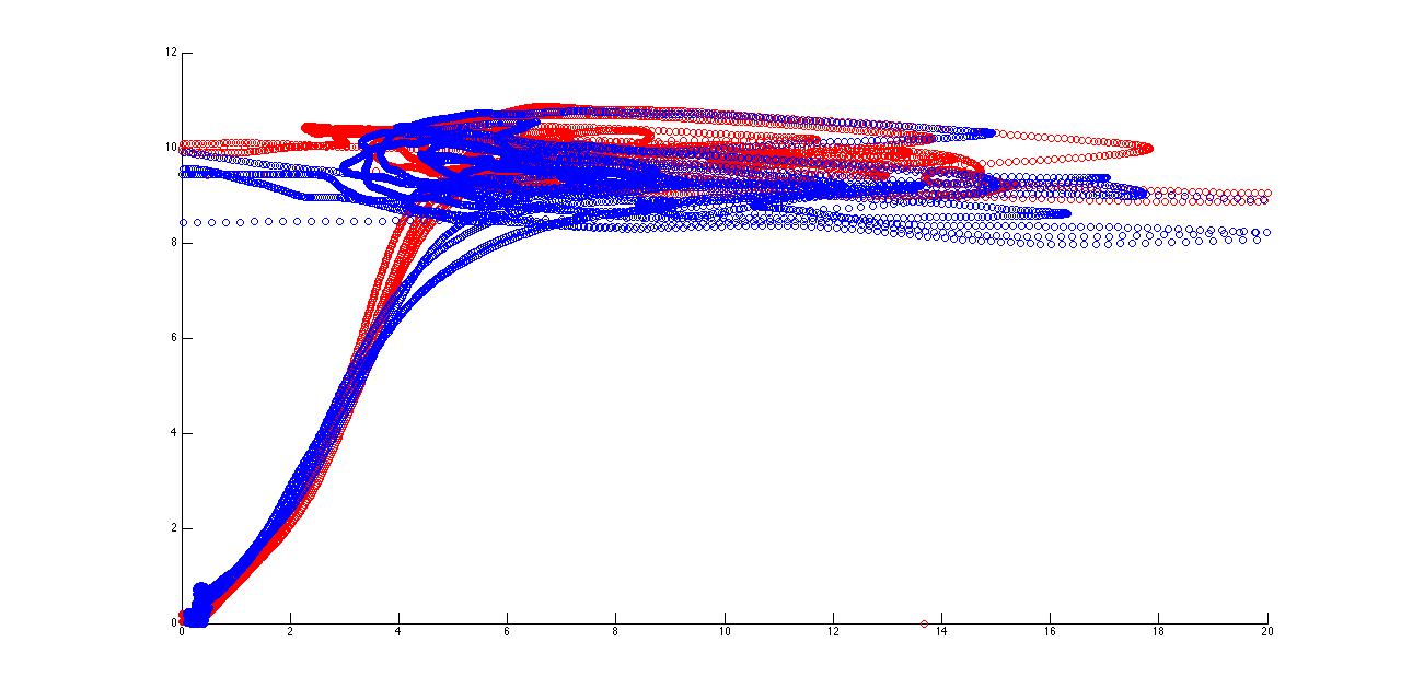 ich habe mir mehrere Messreichen in einem Scatter-Plot darstellen lassen. Man erkennt in der Abbildung das die beiden Kurven ab einem bestimmten Y-Wert sich unterscheiden lassen. Nun würde ich gerne eine "Mittelwert-Kurve" auf den Kurvenscharen der roten und der blauen Kurven erstellen.