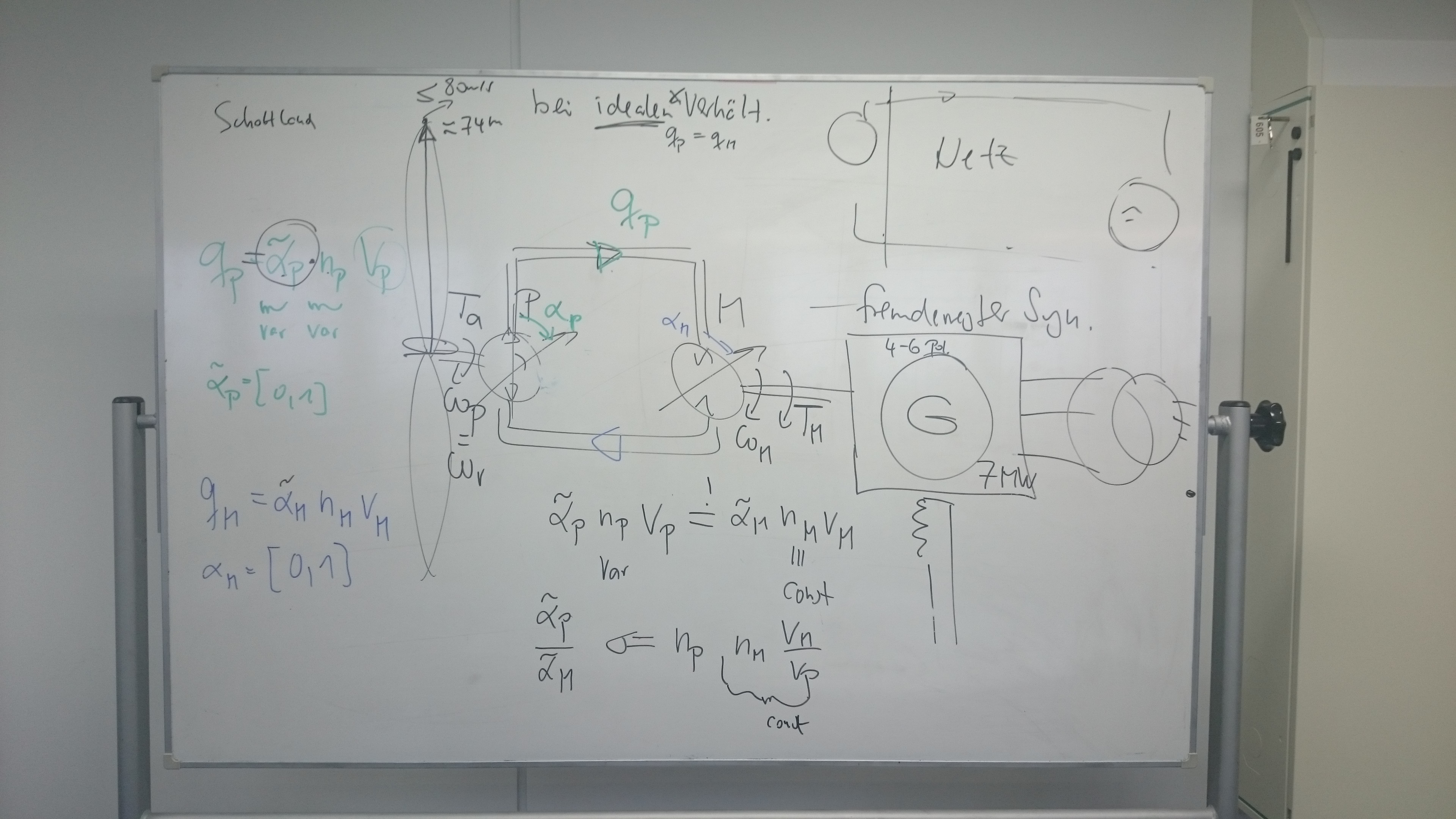 Ja genau so soll das sein. Vor dem Generator sitzt ein hydrostatisches Getriebe, das Übersetzungsverhältnis wird durch den Durchfluss an den bei den hydraulik Pumpen eingestellt. Das Modell von der WEA und dem hydrostatischen Getriebe steht, das hat mein Professor schon entwickelt. Sobald mein Modell ausgereift ist werden die beiden zusammengeführt.