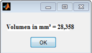 "Volumen in mm³ =" und dahinter der Wert des Volumens.