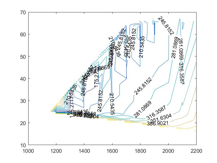 Die Messdaten des Verbrauches, habe ich von Hand aufgenommen. D.H. ich habe bei 25kW und 600 U/min angefangen zu messen, dann bei 650 U/min usw. bis zur Maximaldrehzahl. Das selbe Spiel bei 30kW bis hoch zur Maximalleistung. So habe ich ca. 70 Messpunkte unter der Kurve die ich in Matlab einspeißen will. Wie bekomme ich das hin?