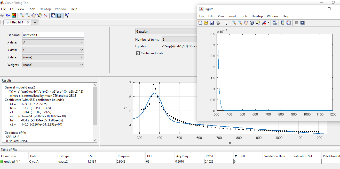 Ich hab mal ein Beispiel in den Anhang gepackt. Auf dem Bild siehst du die vorgeschlagenen Werte für die Koeffizienten vom Curve-Fitting Tool. Rechts ist der Plot, wenn ich die Funktion in Matlab eingebe.