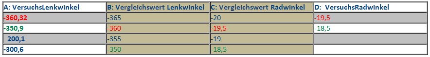 In Spalte 1: Meine gemessenen Lenkwinkel Versuchswerte