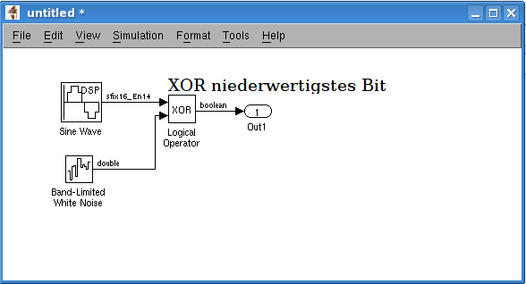 Ich benutze einen Pseudo-Zufallsgenerator und verrausche mit einem XOR das niederwertigste Bit. Wie man auf dem angehängten Screenshot sehen kann, benutze ich einen Data Type Conversion Block zum Umwandeln des Datentyps. Gibt es eine Möglichkeit den Ausgangsdatentyp des Konverters automatisch auf den Datentyp des SineIn-Signals einzustellen?