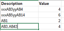 Ich möchte die ganzen Strings auf "AB" untersuchen. Wenn AB enthalten ist sollen die Zahlen danach zurückkommen. Beim ersten String möchte ich also 3 und 4 zurückbekommen.
