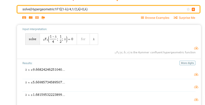 Ich möchte mithilfe der "hypergeom" Funktion und dem Befehl "solve" die Eigenwerte bzw. Nullstellen für folgende koeffizienten berechnen:
